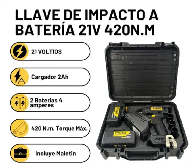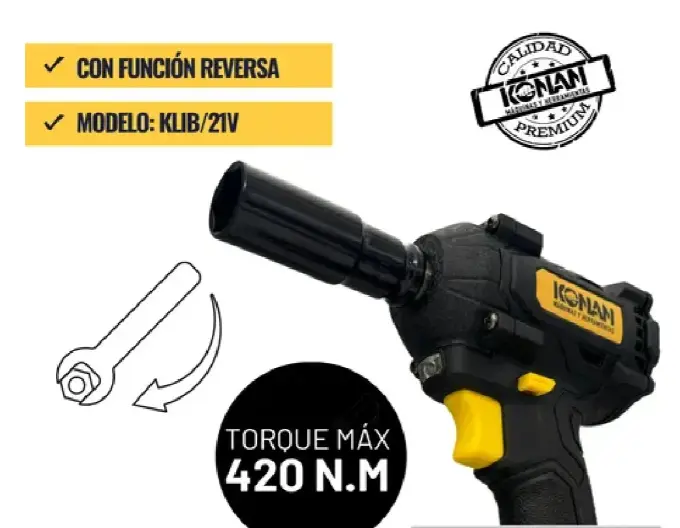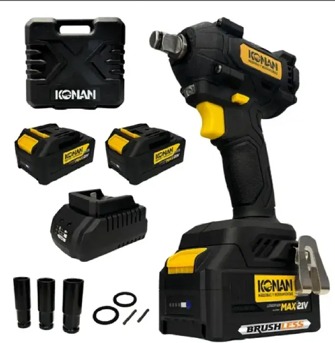La Llave de Impacto Konan XPV 21V combina fuerza, autonomía y comodidad para profesionales exigentes. Su torque de 420 Nm y motor sin carbones permiten realizar cualquier tarea con eficiencia y control, mientras que las baterías de larga duración y el cargador rápido aseguran que el trabajo nunca se detenga.