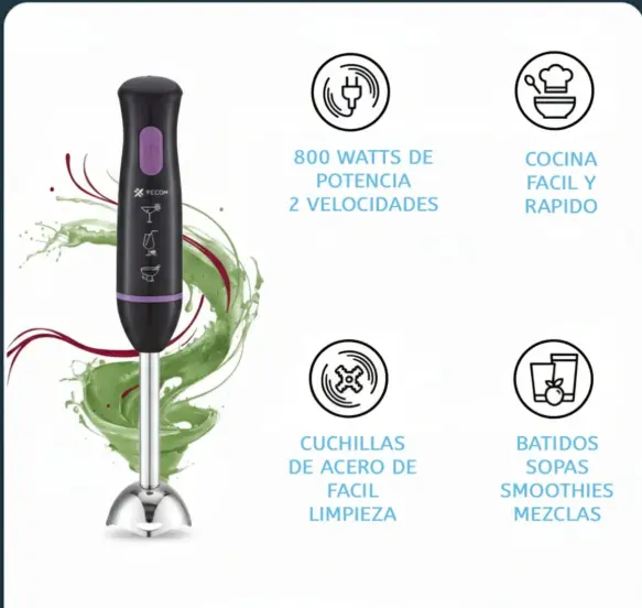 La Minipimer Licuadora de Mano Extra Techh cuenta con un motor de 800W, perfecto para preparar salsas, purés, batidos y más con rapidez y eficiencia.